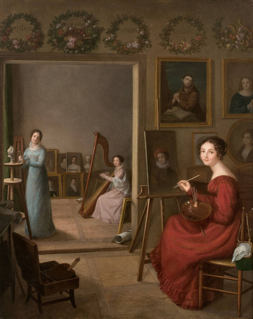 D. E. Brante. Dda bieus sètzia in d-una cadira pintendi, in su cuadru ananti suu, scurpendi e sonendi s’arpa; in su fundu de s’aposentu…