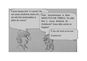 Si fut intèndiu calincunu sùrbiu in mesu de su pùbblicu. Sa fèmina piticheddedda a pilus a colori de arena iat schillitau po sa timoria amesturada a grisu. Goldstein fut unu traitori recidivu chi unu tempus, de diora meda (cantu tempus nemus pròpiu si-ddu arregordàt), fut stètiu unu de is capus de su Partidu, giai paris a su Grandu Fradi etotu, e agoa si-nci fut ghetau a fainas contras-revolutzionàrias, dd’iant cundennau a morti, si fut misteriosamenti fuiu e sparèssiu si fut. Su programa de is Duus Minutus de Tìrria mudàt dònnia dii, ma no ndi ddoi fiat mancunu anca Goldstein no fut sa figura printzipali.