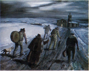 Depiat essi unu “Autoretratu triplu”, aundi su pintori amostat sei etotu tres bortas. A primu, biu de palas, sètziu ananti de su cuaddu de linna (…).
